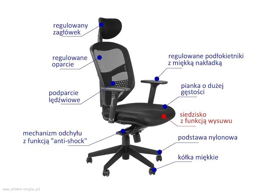 • mechanizm synchroniczny – popularną możliwością tych foteli biurowych jest funkcja Active, a więc synchroniczne odchylanie się siedziska i oparcia. Oferują też narzędzie “Anti-Shock”, czyli zabezpieczenie przed uderzeniem oparcia w plecy użytkownika. Kolejnym plusem, jakim mogą pochwalić się te krzesła biurowe jest mechanizm Epron Syncro, który pozwala zablokować oparcie w kilku pozycjach. Posiada też szeroki zakres jednoczesnego odchylania siedziska i oparcia,