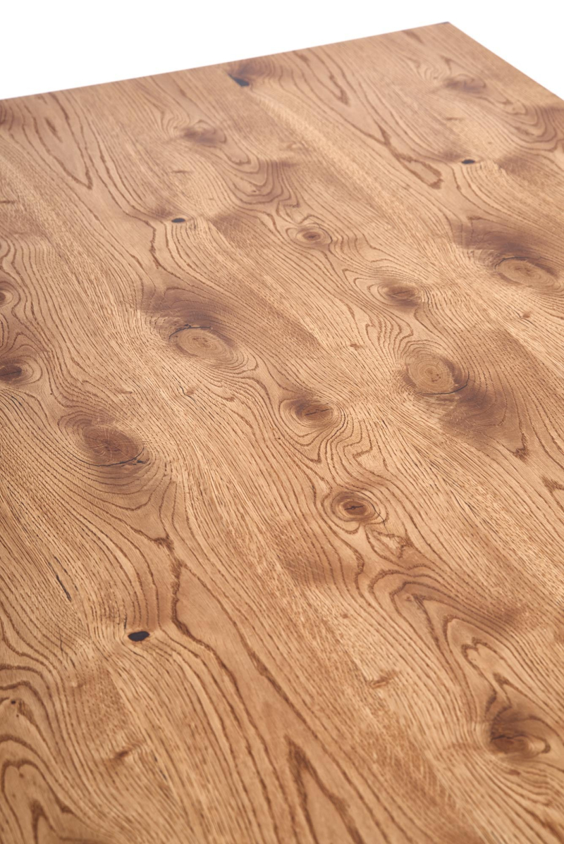 - Design: Naturalne sęki w blacie, wypełnione czarną szpachlą, podkreślają unikalny i rustykalny charakter stołu.