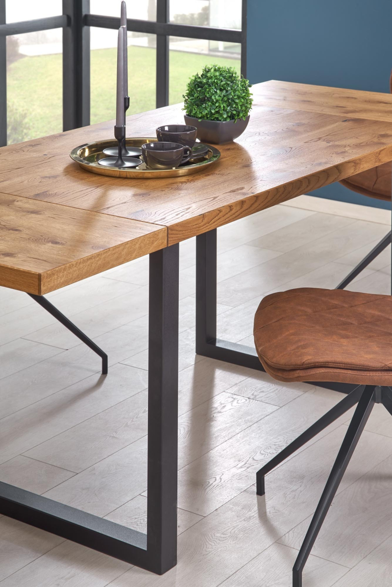 | Stół HORUS to połączenie nowoczesności z rustykalnym urokiem, idealnie wpisujące się w każde wnętrze. Jego rozkładana konstrukcja umożliwia dostosowanie wymiarów od 126 do 206 cm długości, co czyni go doskonałym wyborem na różne okazje oraz spotkania przy rodzinnym stole. - Materiał: Blat wykonany z płyty fornirowanej, na obrzeżach z drewna litego, co zapewnia trwałość i elegancję.