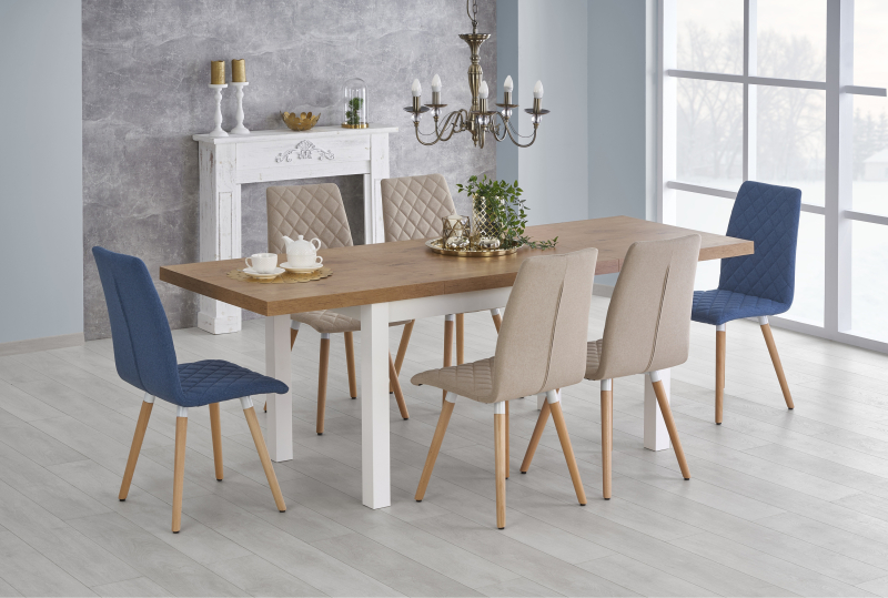| Stół Rozkładany TIAGO – Harmonia Stylu i Funkcjonalności w Twoim Domu Odkryj idealne połączenie klasyki i nowoczesności ze stołem rozkładanym TIAGO. Ten elegancki mebel, wyróżniający się dwukolorowym wykończeniem, doskonale wpasuje się w każde wnętrze, oferując elastyczność i komfort podczas codziennych posiłków oraz większych spotkań rodzinnych. Cechy, które pokochasz: -