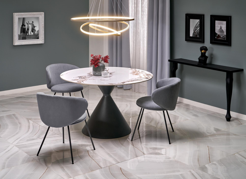 | Stół okrągły GARET to elegancka propozycja, która doskonale wpasuje się w nowoczesne wnętrza, dodając im niepowtarzalnego charakteru. Jego stylowy design łączy w sobie wysokiej jakości materiały oraz estetyczne wykończenie, co sprawia, że jest idealnym miejscem do wspólnych posiłków czy spotkań rodzinnych. Oto, co wyróżnia ten wyjątkowy stół: - Wymiary: średnica 120 cm, wysokość 76 cm – idealne rozmiary do mniejszych oraz średnich przestrzeni.