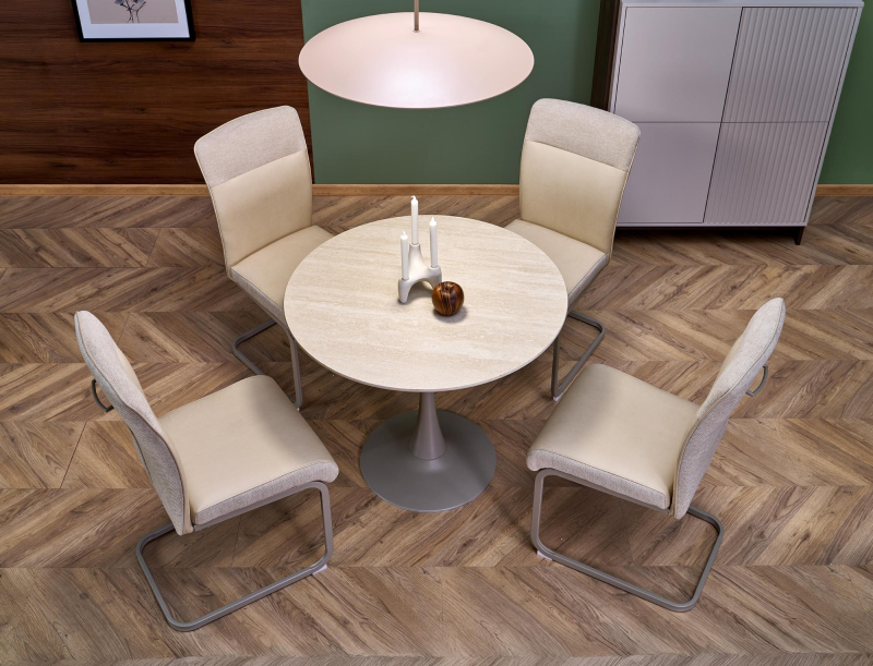 | Stół okrągły TOLIO to perfekcyjny wybór dla osób ceniących sobie elegancję oraz nowoczesny styl. Jego średnica wynosząca 90 cm oraz wysokość 76 cm sprawiają, że idealnie sprawdzi się w mniejszych przestrzeniach, tworząc przytulną atmosferę podczas spotkań z rodziną czy przyjaciółmi. Blat stołu wykonany z jakościowego spieku o wyglądzie trawertynu nie tylko wygląda efektownie, ale jest również bardzo łatwy w pielęgnacji, co czyni go praktycznym rozwiązaniem w codziennym użytkowaniu. Nogi stołu, malowane proszkowo w kolorze kaszmiru, dodają całości lekkości oraz nowoczesności. Dzięki zastosowaniu stali, stół jest stabilny i wytrzymały, co gwarantuje długotrwałe użytkowanie. Stylowe połączenie faktury spieku z delikatnym kolorem nóg sprawia, że stół TOLIO doskonale wpasuje się w różnorodne aranżacje, od minimalistycznych po te bardziej klasyczne. W trosce o komfort użytkowania, stół został zaprojektowany z myślą o łatwym montażu, co pozwala na jego szybkie złożenie w warunkach domowych. Zawarta w przesyłce instrukcja montażu ułatwi cały proces, zapewniając, że wkrótce po zakupie będziesz mógł cieszyć się nowym meblem w swoim wnętrzu. - Wymiary: fi90/76 cm