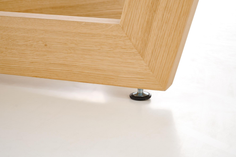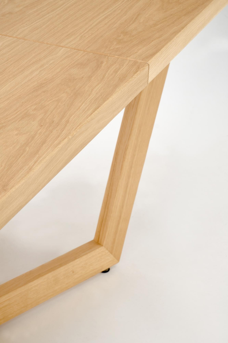 - Materiał: Blat wykonany z płyty fornirowanej, co zapewnia elegancki wygląd; obrzeża z litego drewna oraz nogi także z solidnego drewna dębowego gwarantują stabilność i wytrzymałość.