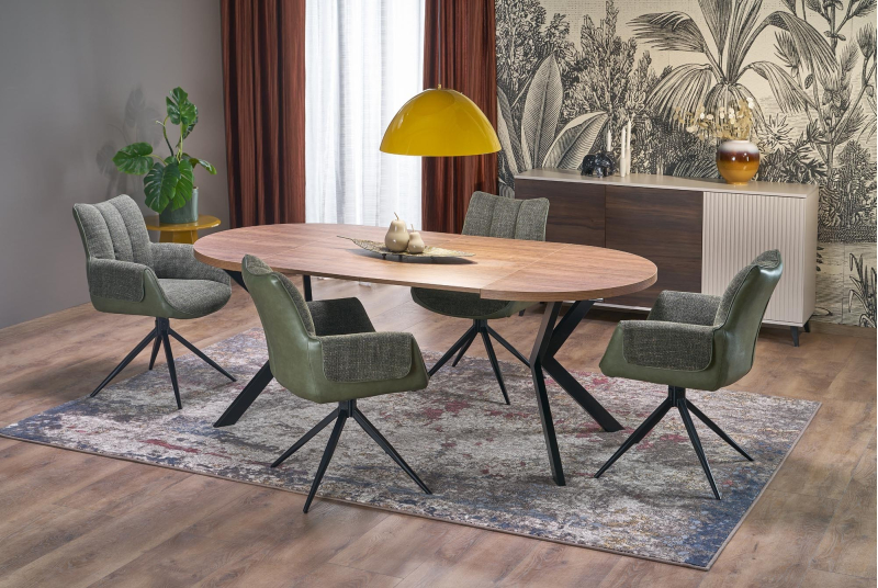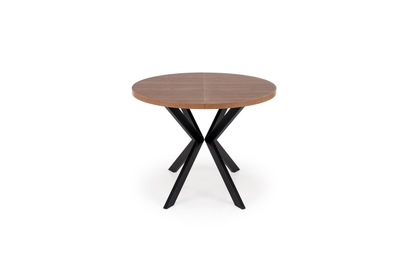 | Stół Rozkładany PERONI – Elastyczność Formy i Funkcjonalności w Twojej Jadalni Odkryj stół rozkładany PERONI, który zachwyca swoją adaptacyjnością i eleganckim designem. Ten wyjątkowy mebel transformuje się z kompaktowego, okrągłego stołu o średnicy 100 cm w przestronny, owalny stół o wymiarach 100 x 250 cm, idealny na każdą okazję – od codziennych posiłków po większe spotkania towarzyskie. Jego blat wykonany z wysokiej jakości płyty meblowej okleinowanej w ciepłym odcieniu orzecha wiernie oddaje piękno naturalnego drewna, wprowadzając do wnętrza atmosferę ciepła i wyrafinowania. Solidna podstawa z malowanej proszkowo na czarno stali zapewnia nie tylko stabilność, ale również dodaje nowoczesnego, industrialnego charakteru. Kontrast między bogatym odcieniem orzecha a matową czernią nóg tworzy stylową i ponadczasową kompozycję, która z łatwością wkomponuje się w różnorodne aranżacje wnętrz. Specyfikacja: -