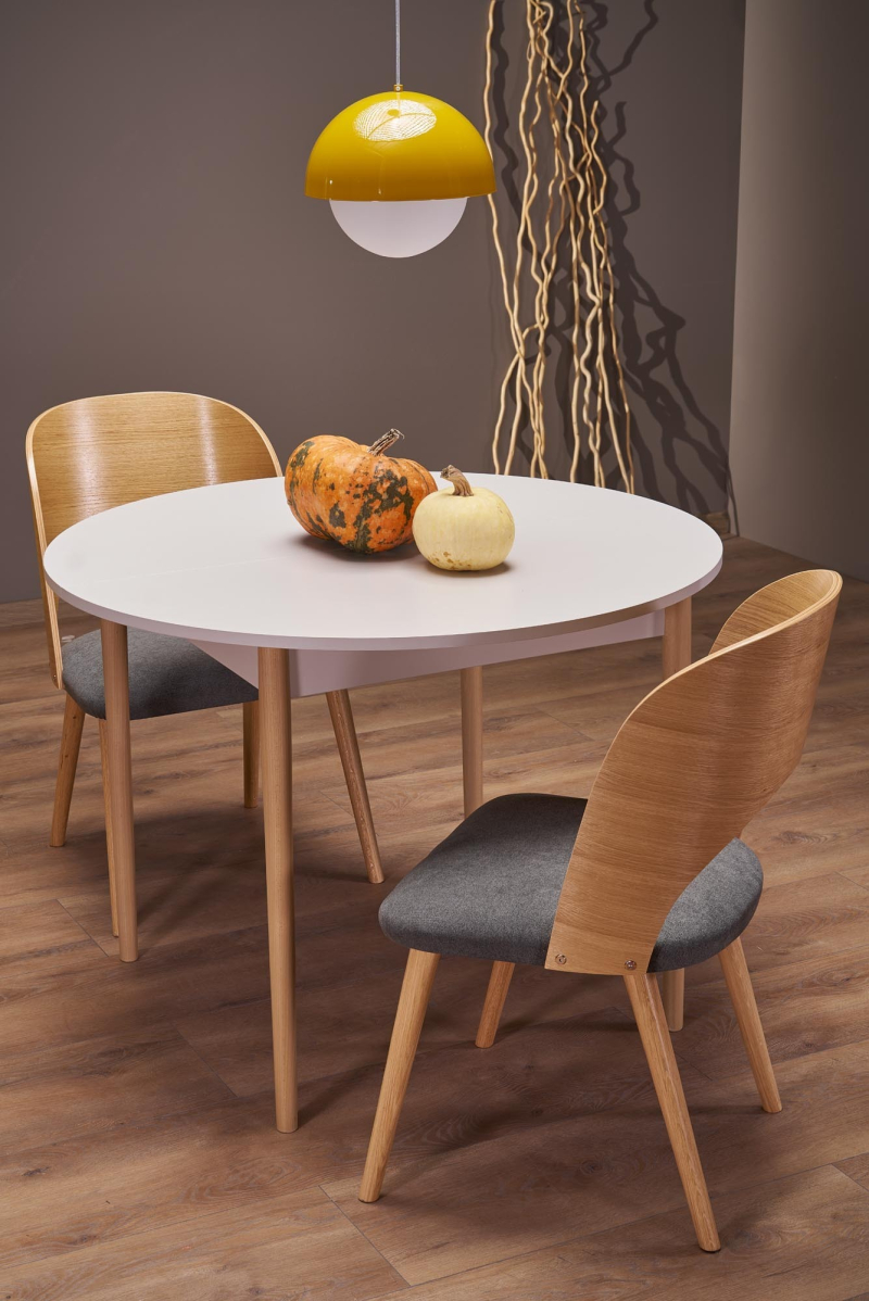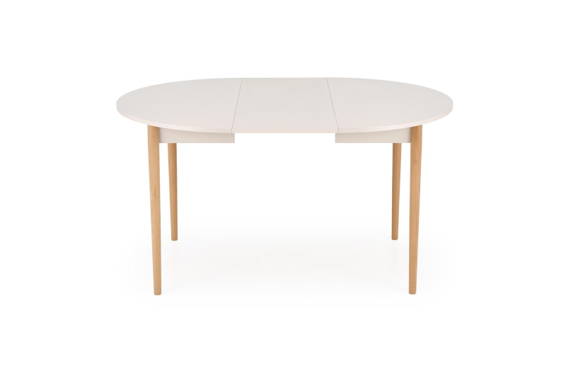 Stół Rozkładany PIVOT – Kompaktowa Elegancja z Funkcją Powiększenia Poznaj stół rozkładany PIVOT, który łączy w sobie subtelny design i praktyczną możliwość dostosowania rozmiaru. Idealny do mniejszych przestrzeni, na co dzień oferuje okrągły blat o średnicy 102 cm. W razie potrzeby, z łatwością rozłożysz go do owalnego stołu o wymiarach 102 x 142 cm, zapewniając wygodne miejsce dla większej liczby gości. Wysokość stołu wynosząca 75 cm gwarantuje komfortowe użytkowanie. Blat stołu PIVOT wykonany jest z płyty meblowej laminowanej w eleganckim i uniwersalnym kolorze kaszmir, który wprowadzi do Twojego wnętrza nutę nowoczesnej subtelności. Solidne, lekko skośne nogi wykonane z litego drewna bukowego w naturalnym odcieniu dodają stołowi skandynawskiego uroku i zapewniają stabilność konstrukcji. Połączenie matowego, kaszmirowego blatu z ciepłym odcieniem naturalnego drewna bukowego tworzy harmonijne i ponadczasowe zestawienie, które doskonale wpisze się w różnorodne style aranżacji – od nowoczesnego minimalizmu po przytulny styl skandynawski. Funkcja rozkładania sprawia, że stół PIVOT jest niezwykle praktycznym rozwiązaniem do jadalni, kuchni czy salonu. Pozwala na elastyczne zarządzanie przestrzenią i dostosowanie jej do aktualnych potrzeb. Specyfikacja: -