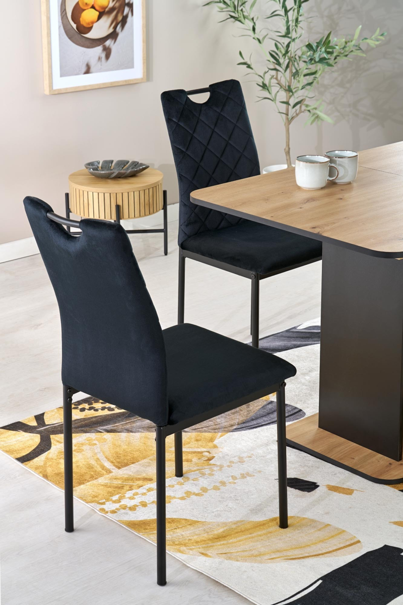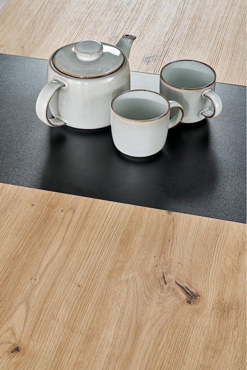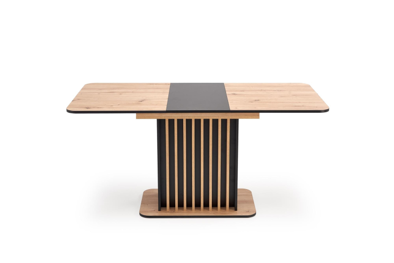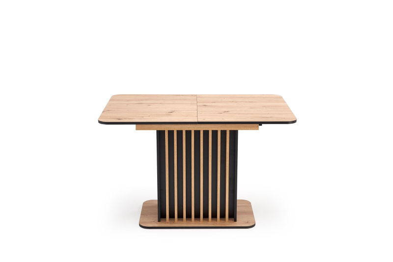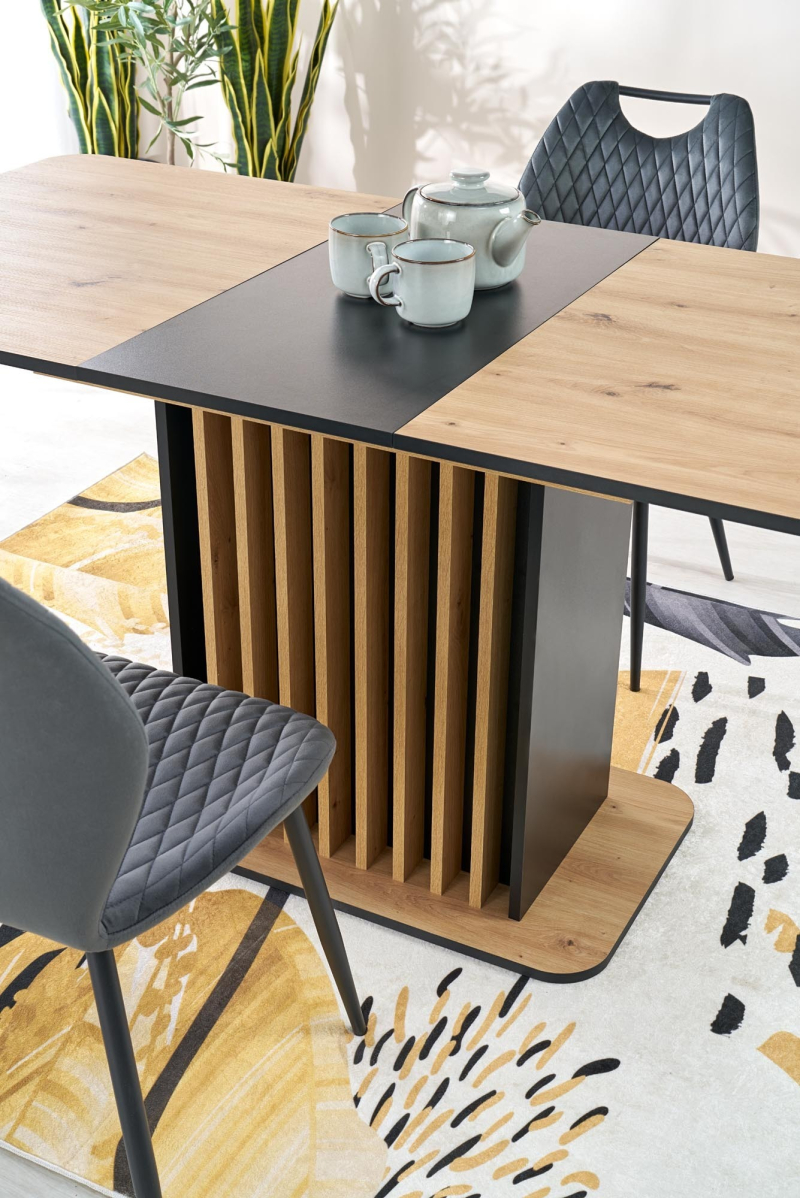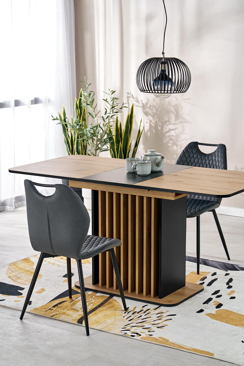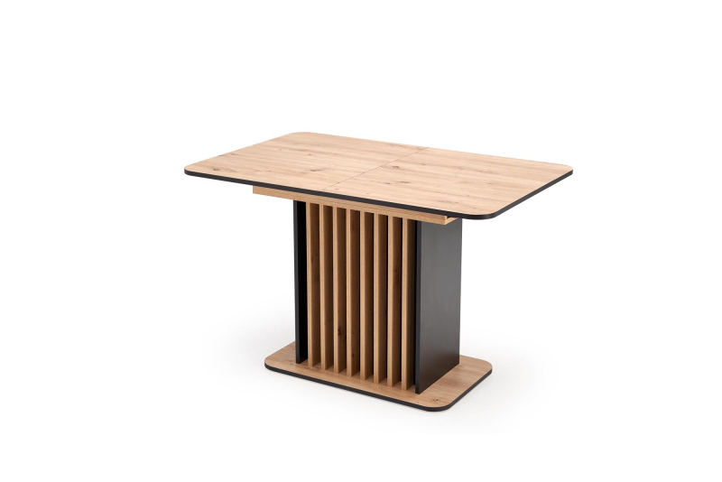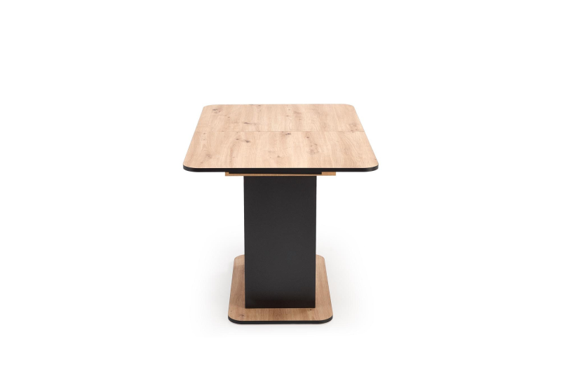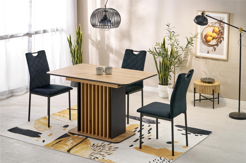 Stół rozkładany WILSON to perfekcyjne połączenie funkcjonalności i elegancji, które sprawdzi się w każdej jadalni czy kuchni. Jego minimalistyczny design z pewnością przyciągnie wzrok Twoich gości. Stół został wykonany z wysokiej jakości płyty meblowej laminowanej, co zapewnia trwałość i łatwość w utrzymaniu czystości. Blat w kolorze dębu artisan z kontrastującymi czarnymi nogami tworzy nowoczesny i stylowy efekt, idealny dla miłośników minimalistycznych wnętrz.