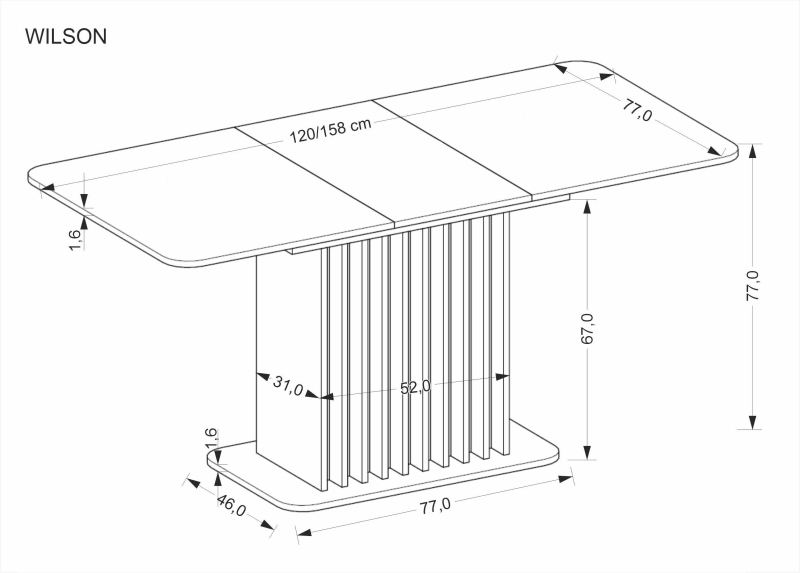 WILSON to stół, który dostosowuje się do Twoich potrzeb. Dzięki możliwości rozkładania, możesz łatwo powiększyć jego powierzchnię z 120 cm do 158 cm, co czyni go idealnym rozwiązaniem na większe spotkania rodzinne czy przyjęcia. Jego wysokość wynosząca 77 cm sprawia, że jest wygodny do codziennego użytku.