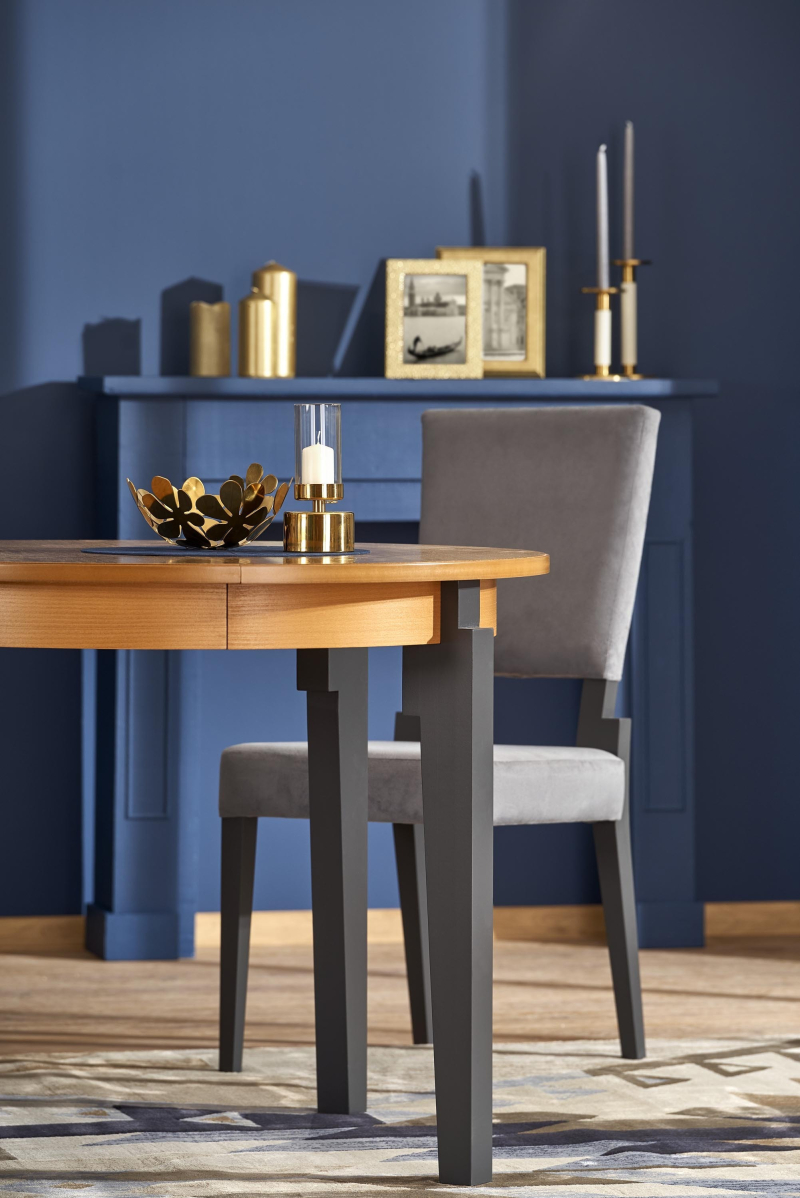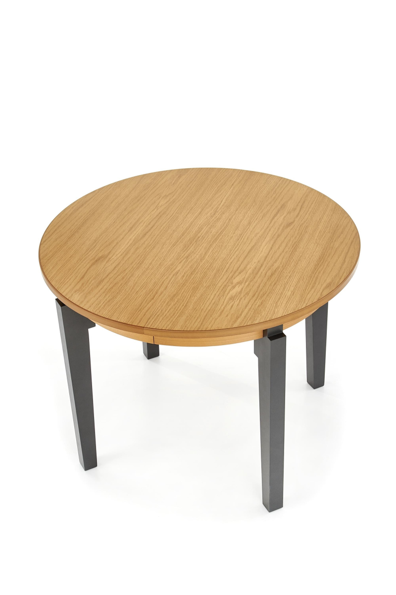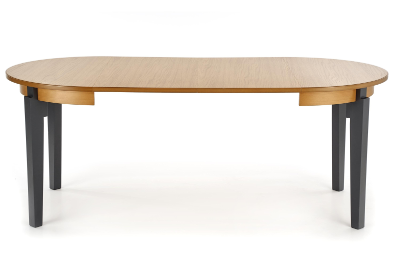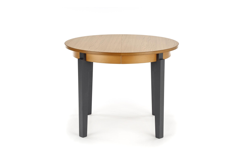 Wysokiej jakości materiały: Blat stołu wykonany jest z trwałego MDF-u pokrytego naturalną okleiną dębową w ciepłym odcieniu dębu miodowego. Solidne nogi z litego drewna bukowego, wybarwione na elegancki grafitowy kolor, gwarantują stabilność i długowieczność konstrukcji. -