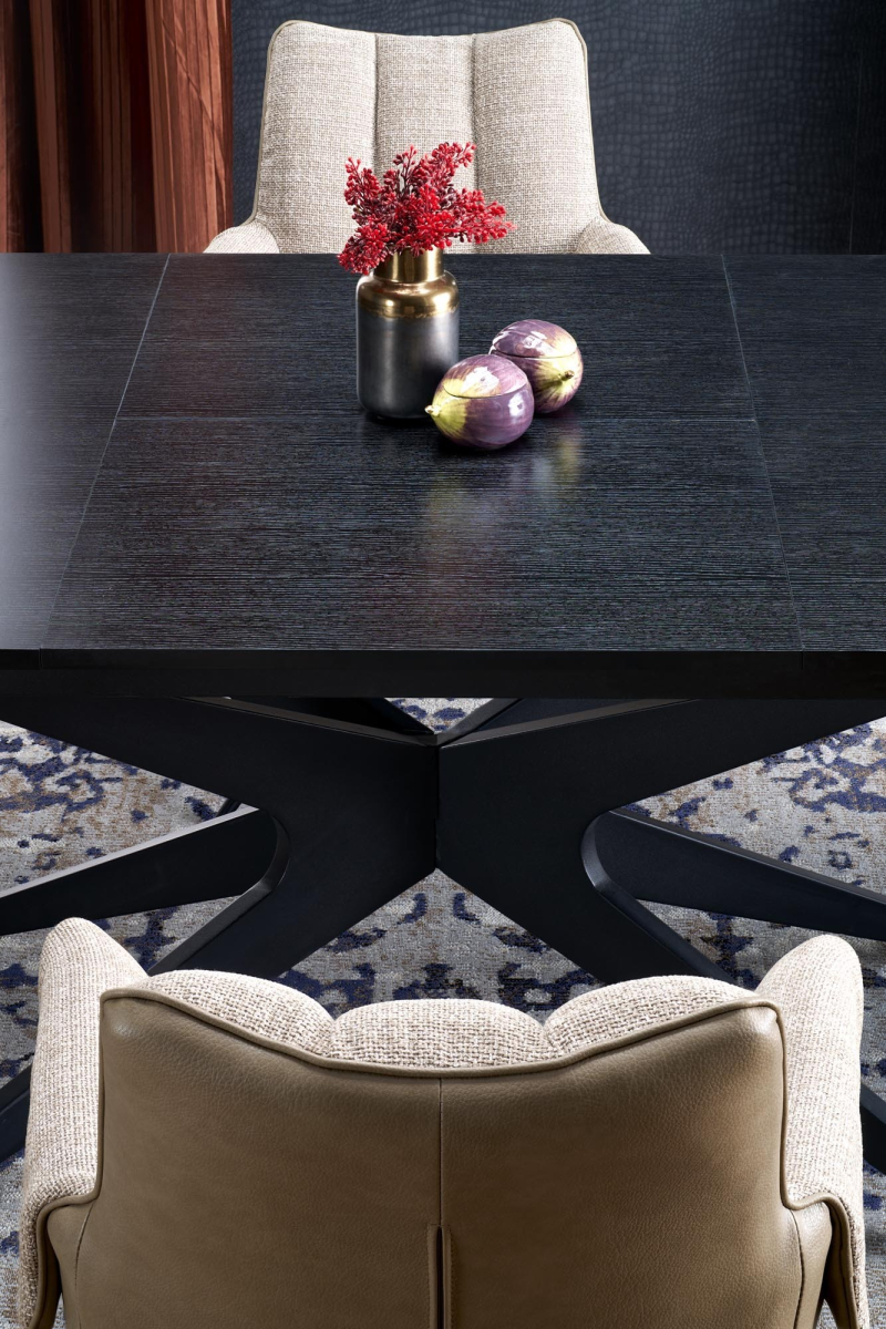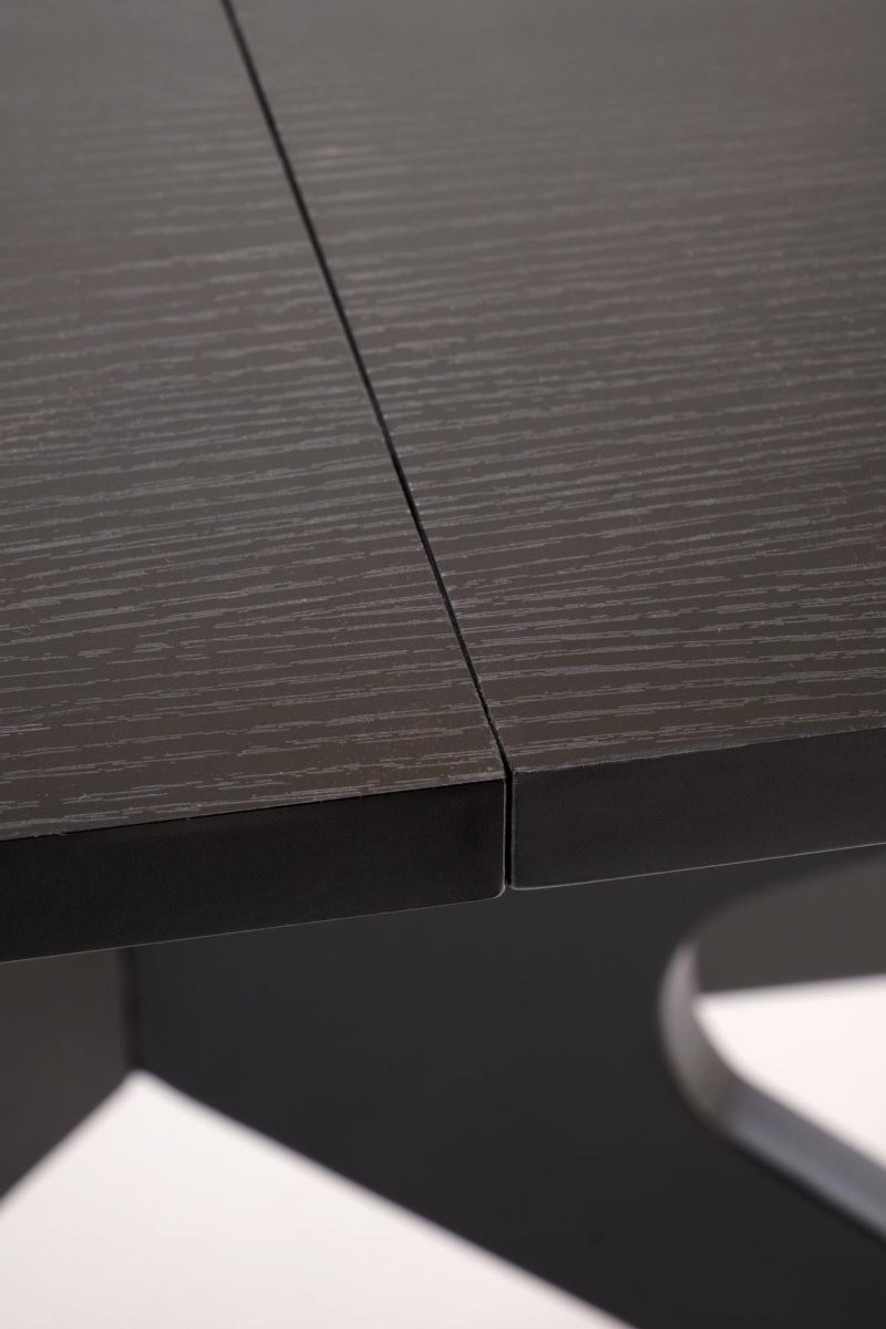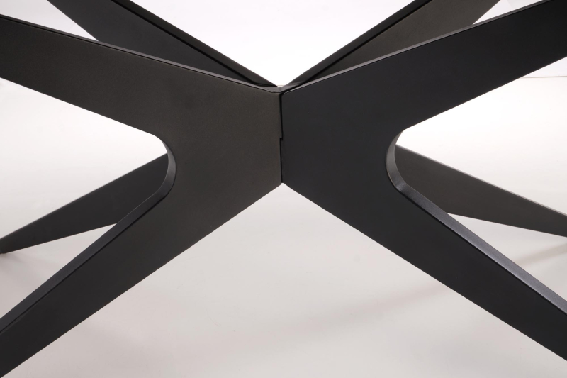 Solidna podstawa stołu wykonana jest z malowanej proszkowo stali również w eleganckim czarnym kolorze. Jej unikalna, geometryczna forma w kształcie skrzyżowanych nóg przyciąga wzrok i zapewnia stabilność całej konstrukcji.