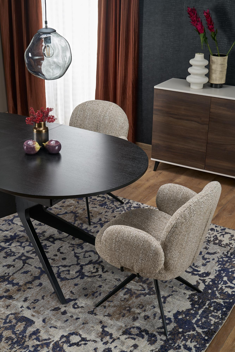 Stół SANDRO wyróżnia się blatem wykonanym z trwałego MDF okleinowanego melaminą w głębokim czarnym kolorze. To wykończenie nie tylko prezentuje się niezwykle nowocześnie, ale również jest odporne na zarysowania i łatwe w utrzymaniu czystości. Jego owalny kształt dodaje mu subtelności i sprzyja swobodnej komunikacji przy stole.