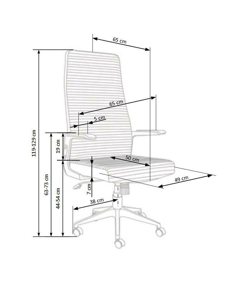 - Wymiary: 65 cm (szerokość) x 65 cm (głębokość) x 119-129 cm (wysokość) z możliwością regulacji wysokości siedziska 44-54 cm.