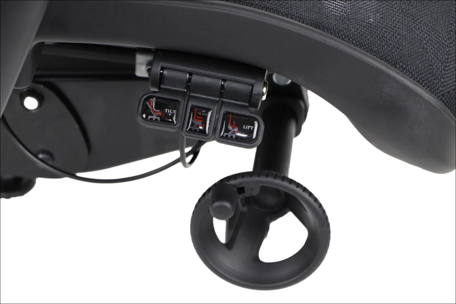 Regulacja wysokości, odchyłu i wysuwu odbywa się za pomocą przycisków umiejscowionych przy siedzisku