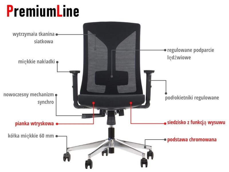 Fotel obrotowy posiada między innymi takie funkcje jak: mechanizm synchroniczny z wysuwem siedziska, regulowane podłokietniki, regulowane podparcie lędźwiowe a siedzisko wykonane jest z pianki wtryskowej, co zapewni długie użytkowanie fotela. Fotel obrotowy klasy PREMIUM Line - Polecamy!