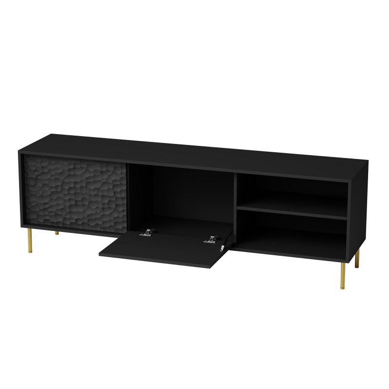 | Odkryj Stolik RTV BULLET RTV-1 – idealne połączenie stylu i funkcjonalności dla Twojej strefy rozrywki! Ten elegancki stolik RTV o wymiarach 180/41/58 cm (szerokość/głębokość/wysokość) to wyrafinowany element kolekcji BULLET, który doda Twojemu salonowi nowoczesnego charakteru. Wykonany z wysokiej jakości płyty meblowej laminowanej i MDF laminowanego w ponadczasowym czarnym kolorze, stolik RTV zachwyca subtelnym dekorem 3D na jednym z frontów, nadającym mu unikalnej tekstury i luksusowego wyglądu. Smukłe złote nóżki z polipropylenu nie tylko zapewniają stabilność, ale również stanowią stylowy akcent, podkreślający elegancję mebla. Stolik RTV BULLET RTV-1 oferuje przemyślaną przestrzeń do przechowywania Twojego sprzętu multimedialnego, akcesoriów i innych przedmiotów. Otwarta półka idealnie sprawdzi się na dekoder czy konsolę, a zamykana szafka pomoże ukryć mniej estetyczne elementy. Dzięki swojej długości, stolik doskonale sprawdzi się pod dużym telewizorem, tworząc spójną i stylową aranżację. Informacje dodatkowe: -