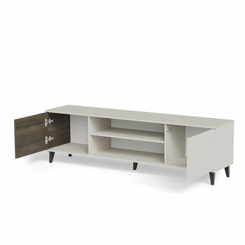 Szafka RTV z Kominkiem RANDOM 2 RTV-K – Ciepło i Styl w Twoim Salonie Przedstawiamy szafkę RTV z kominkiem RANDOM 2 RTV-K, która łączy w sobie nowoczesny design, funkcjonalność oraz przytulną atmosferę, jaką tworzy wbudowany kominek elektryczny. Jej unikalne połączenie kolorystyczne kaszmiru i orzecha z czarnymi akcentami sprawia, że stanie się ona wyjątkowym elementem Twojej strefy relaksu. Wyjątkowe Połączenie Kolorów, Detali i Ognia: Szafka RTV RANDOM 2 RTV-K charakteryzuje się nowoczesnym zestawieniem subtelnego kaszmiru i ciepłego odcienia orzecha, uzupełnionym o eleganckie, czarne nóżki. Jeden z frontów posiada ryflowaną strukturę w kolorze kaszmiru, dodając meblowi unikalnego charakteru. Centralnym punktem jest wbudowany kominek elektryczny, który wizualnie ociepla wnętrze, tworząc przyjemną atmosferę bez konieczności tradycyjnego paleniska. Funkcjonalność i Przestrzeń: Dzięki wymiarom 180 cm szerokości, 40 cm głębokości i 52 cm wysokości, szafka RTV oferuje wystarczającą przestrzeń na Twój telewizor oraz sprzęt audio-wideo. Zamknięte szafki pomogą ukryć kable i inne akcesoria, utrzymując porządek w Twoim salonie. Wysoka Jakość Materiałów: Szafka RTV została wykonana z wysokiej jakości materiałów: płyty meblowej okleinowanej oraz MDF okleinowanego, co gwarantuje jej trwałość i estetyczny wygląd na lata. Solidne nóżki z polipropylenu zapewniają stabilność i dodają nowoczesnego akcentu. Wbudowany kominek elektryczny jest bezpieczny i łatwy w obsłudze. Specyfikacja Produktu: -
