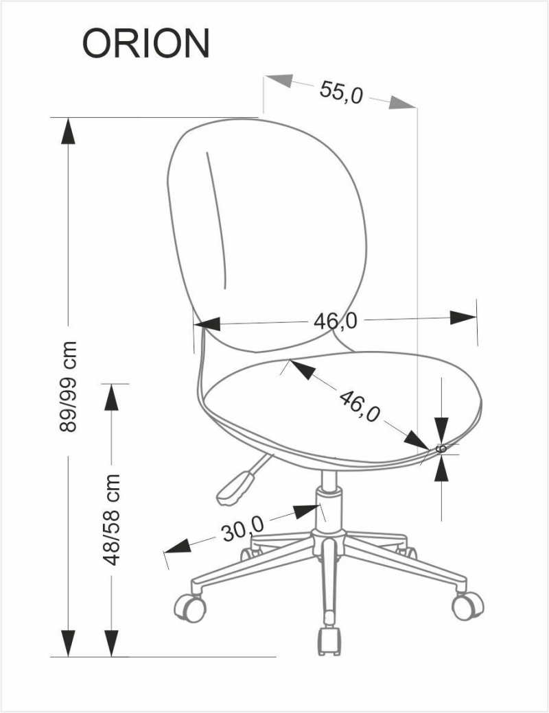 • Wymiary: 46/55/89-99/48-58 cm (szerokość/głębokość/wysokość całkowita/wysokość siedziska), z tolerancją +/- 1-2%.