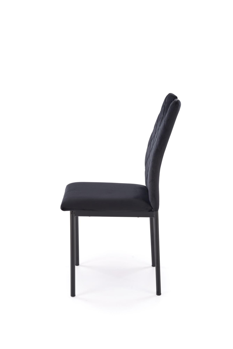 Solidna metalowa rama: Krzesło jest osadzone na wytrzymałej metalowej ramie z czterema prostymi nogami w kolorze czarnym, proszkowo malowanym wykończeniu, co zapewnia stabilność i trwałość. -