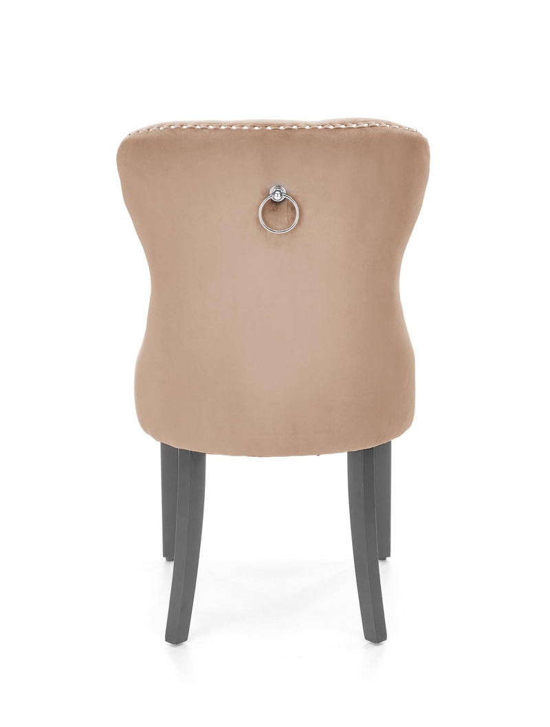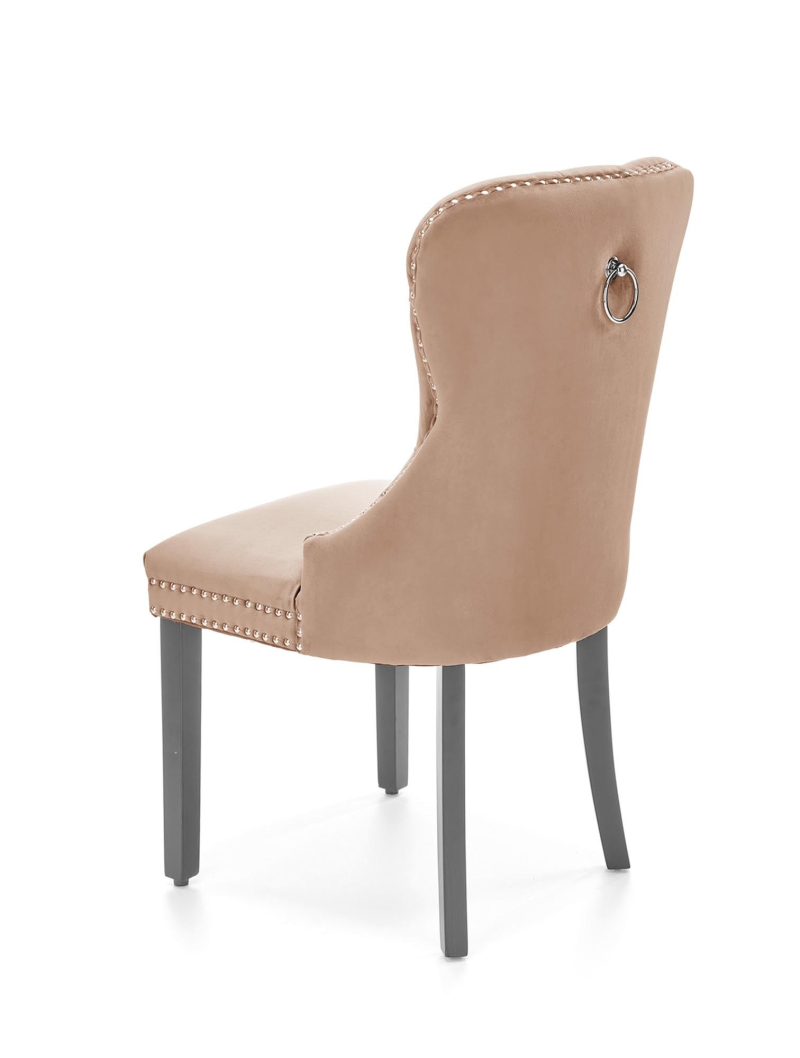 | Krzesło MIYA - Klasyczna Elegancja z Nutą Glamour Odkryj kwintesencję elegancji i komfortu w krześle MIYA. Jego klasyczny design, wzbogacony o charakterystyczne pikowanie i ozdobne detale, sprawia, że staje się ono wyjątkowym elementem każdego wnętrza. Idealne do jadalni, salonu, a nawet stylowego gabinetu. Wyrafinowany Design i Detale Krzesło MIYA wyróżnia się wysokim, lekko wygiętym oparciem, które jest głęboko pikowane, nadając mu luksusowy charakter. Dodatkowo, ozdobne pineski umieszczone na krawędziach siedziska i oparcia podkreślają jego wyjątkowy styl. Luksusowy Komfort Miękka, welwetowa tapicerka (BLUVEL 40) w odcieniu beżu zapewnia niezrównany komfort siedzenia. Tkanina jest przyjemna w dotyku i dodaje wnętrzu ciepła. Ergonomicznie wyprofilowane oparcie i miękkie siedzisko gwarantują wygodę nawet podczas długotrwałego użytkowania. Solidna Konstrukcja Stabilna konstrukcja krzesła wykonana jest z litego drewna kauczukowego, pomalowanego na czarny kolor. Solidne nogi zapewniają trwałość i stabilność, a ich ciemny odcień tworzy elegancki kontrast z beżową tapicerką. Cechy Produktu: -