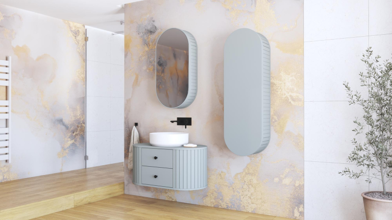 Przedstawiamy szafkę lustrzaną VENEZIA, która łączy w sobie wyjątkowy design i praktyczne rozwiązania, idealnie pasując do nowoczesnych łazienek. Jej owalny kształt, połączony z frontem lustrzanym i matowym wykończeniem w kolorze fjord, nada Twojemu wnętrzu świeżości i oryginalnego charakteru.