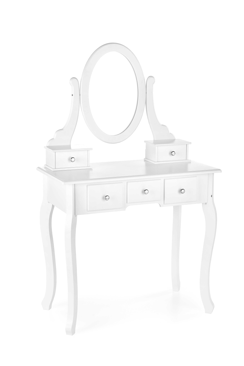 Przemyślana konstrukcja: Konsolka wyposażona jest w liczne szuflady, zapewniające dużo miejsca na kosmetyki, biżuterię i inne drobiazgi, pomagając utrzymać porządek. Dwie mniejsze szufladki umieszczone na blacie oraz trzy większe pod blatem gwarantują wygodne rozmieszczenie przedmiotów. -