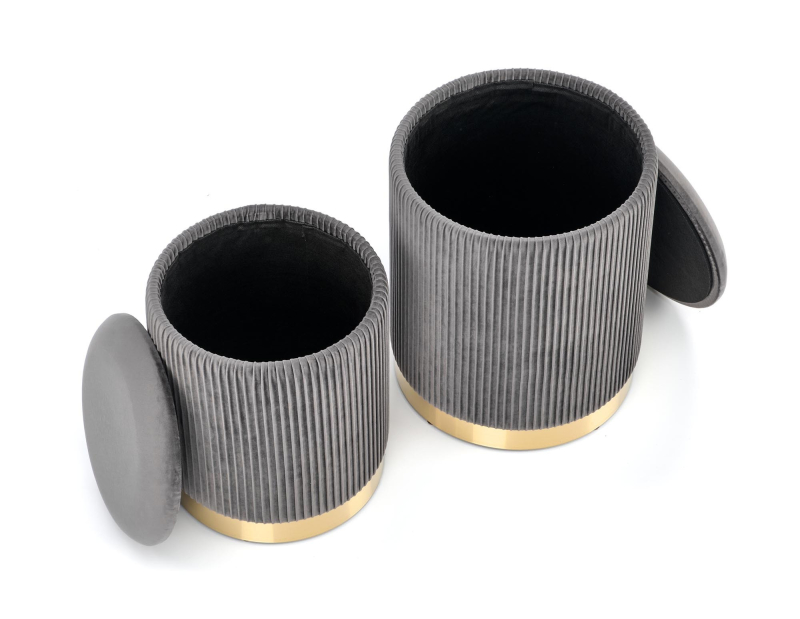 - Kolorystyka: Delikatny popielaty odcień połączony ze złotymi detalami, które sprawiają, że pufy stają się prawdziwą ozdobą wnętrza.